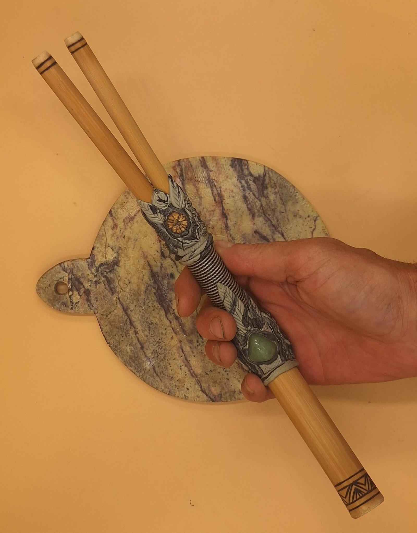 Hochwertiges Doppelfass-Tepi mit wunderschönen Epoxidharz-Arbeiten und pyrographischen Details.