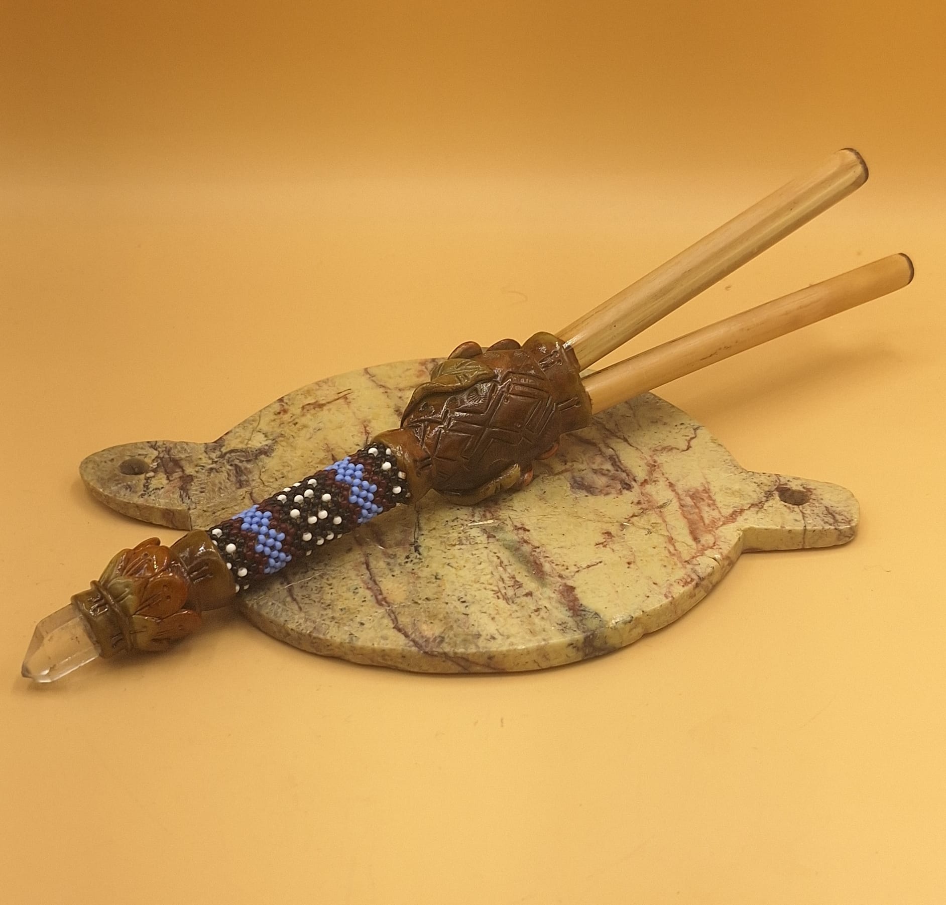 Se trata de un Kuripe de bambú de tamaño XL con arte pirográfico, un cristal en la parte inferior y un maravilloso arte de abalorios. No olvidemos el cristal en la parte inferior.