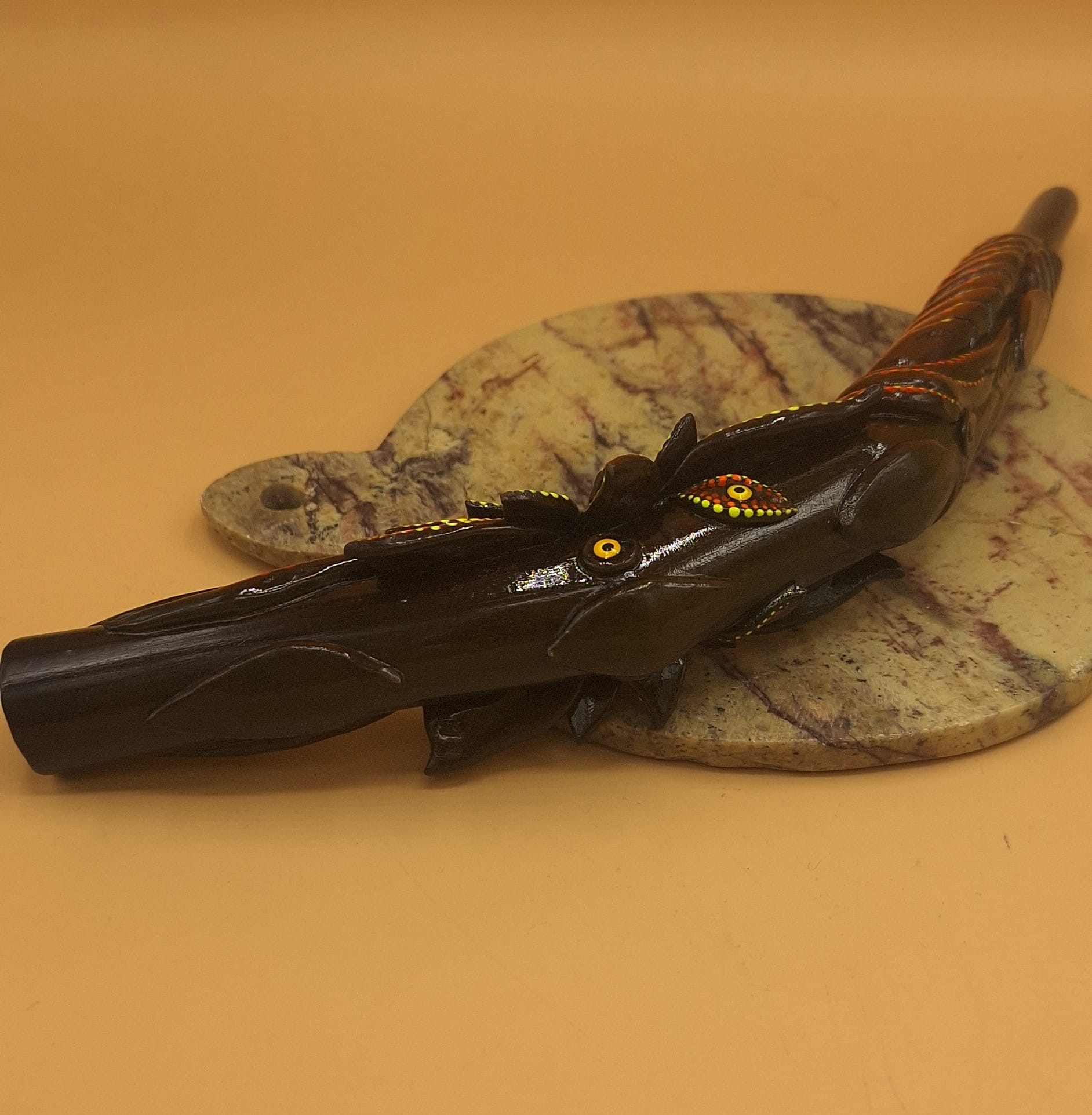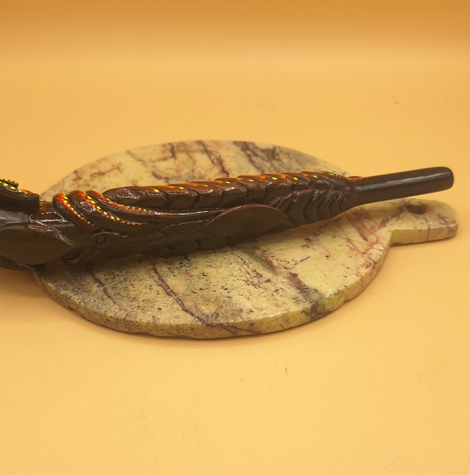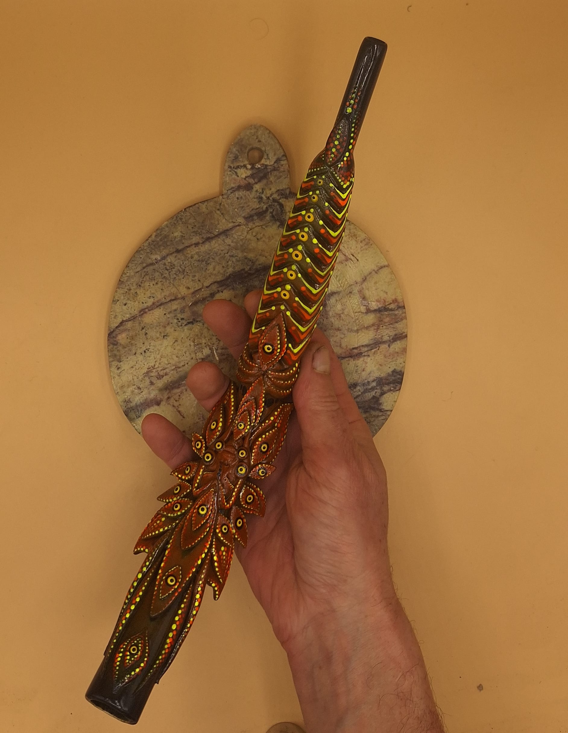 This artwork comes from a Brazilian friend from São Paulo. He is a regular Brazilian from the big city. Over the years, he has developed a unique style for the Tepi and kuripe he makes. The inspiration for his pieces comes from nature, animals, and Indian spirituality. These pieces are all unique. Personally, I have not seen this style before, and I am happy to present my friend’s work in my shop.