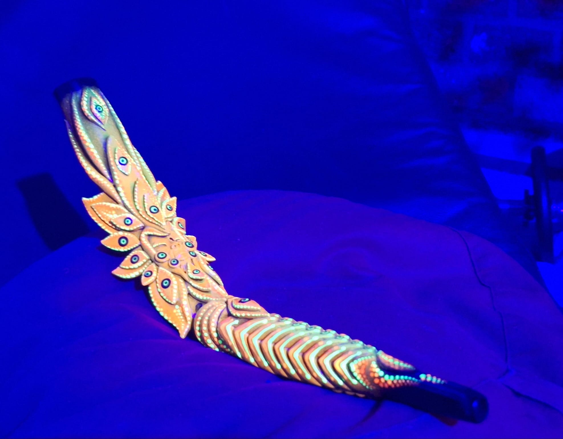 Bamboo is used for the pipe itself but also for the various structures, shapes, and forms. Some of the pieces are also plastered with cold porcelain and then shaped to their desired form. All the pieces are very detailed. Decorated with normal paint but also with a special paint that glows when exposed to black light. In Brazil, various groups do their ceremonies in the dark, combined with black light. It is in this light that the extra magic of his pieces shows itself.