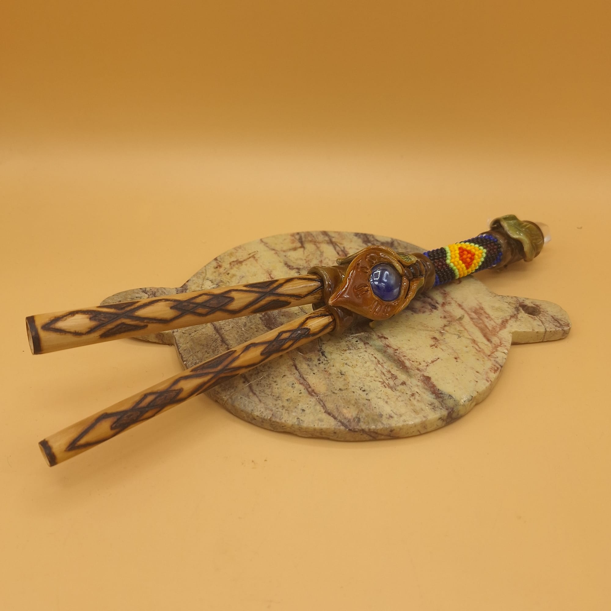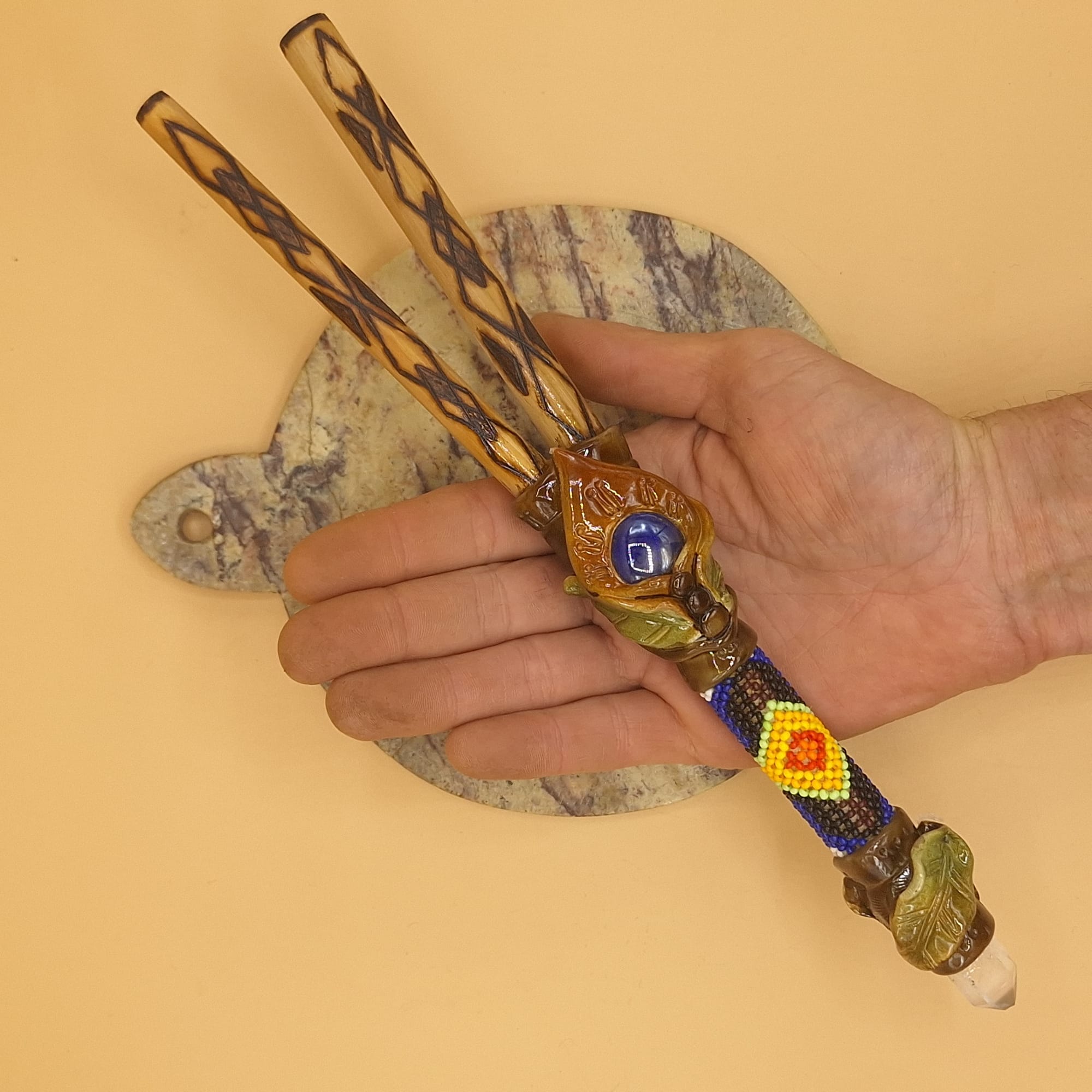 This is an XL-sized bamboo Kuripe with pyrographic art a crystal on the bottom and wonderful bead art. Let’s not forget the crystal at the bottom.